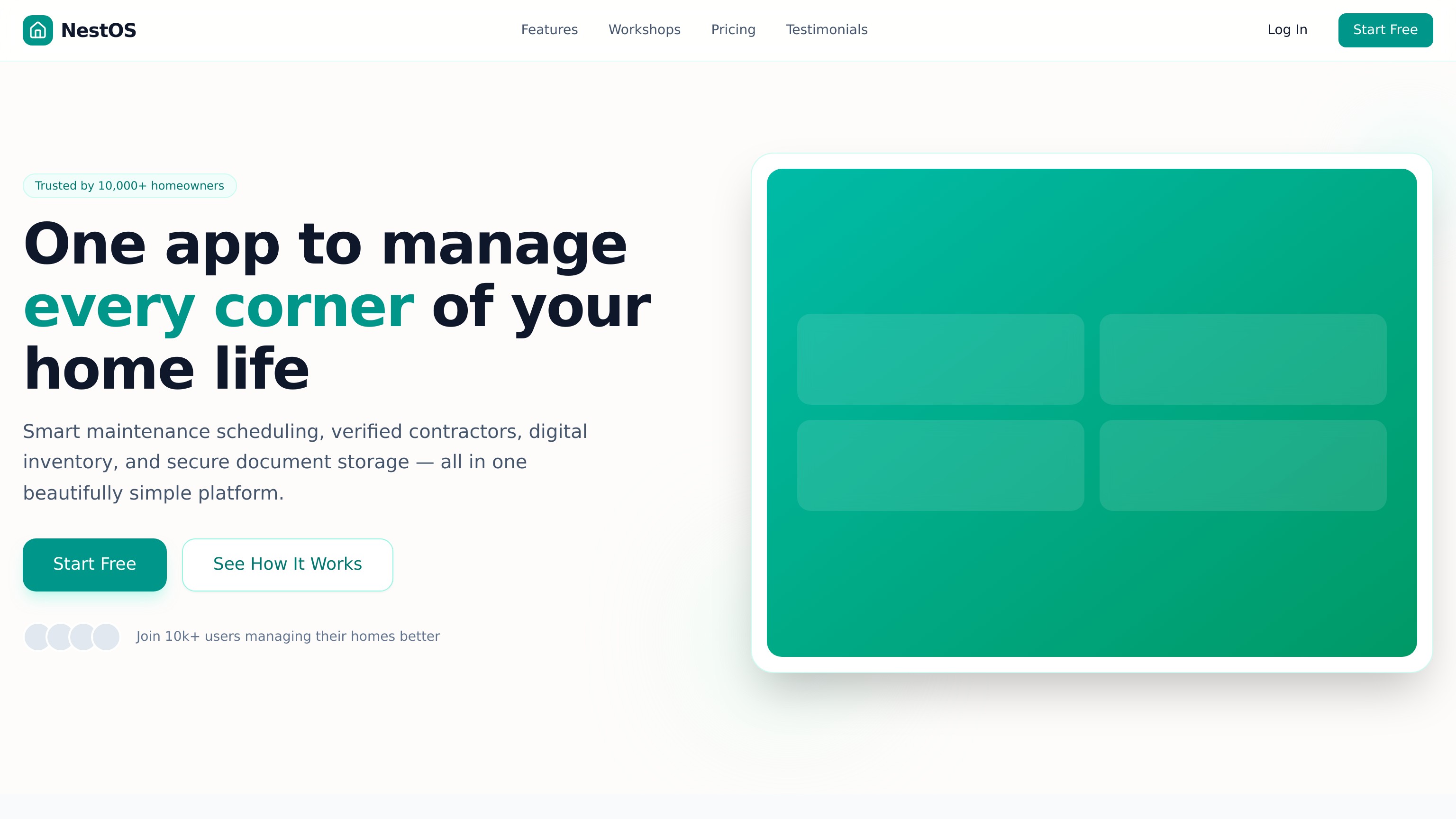 NestOS is a complete home management platform that helps homeowners manage their entire home life in one place. What's included in this listing: - Fully designed landing page ready to publish - Home maintenance scheduling system - Digital appliance and warranty tracker - Secure document vault for home files - Home expense tracking dashboard - Verified contractor booking marketplace - 4-tier subscription model (Free, Homeowner, Landlord, Pro) - Stripe payment integration ready - Mobile responsive design - SEO optimized for US, UK and Canada markets Perfect for developers or entrepreneurs who want to launch a home management SaaS business without starting from scratch.