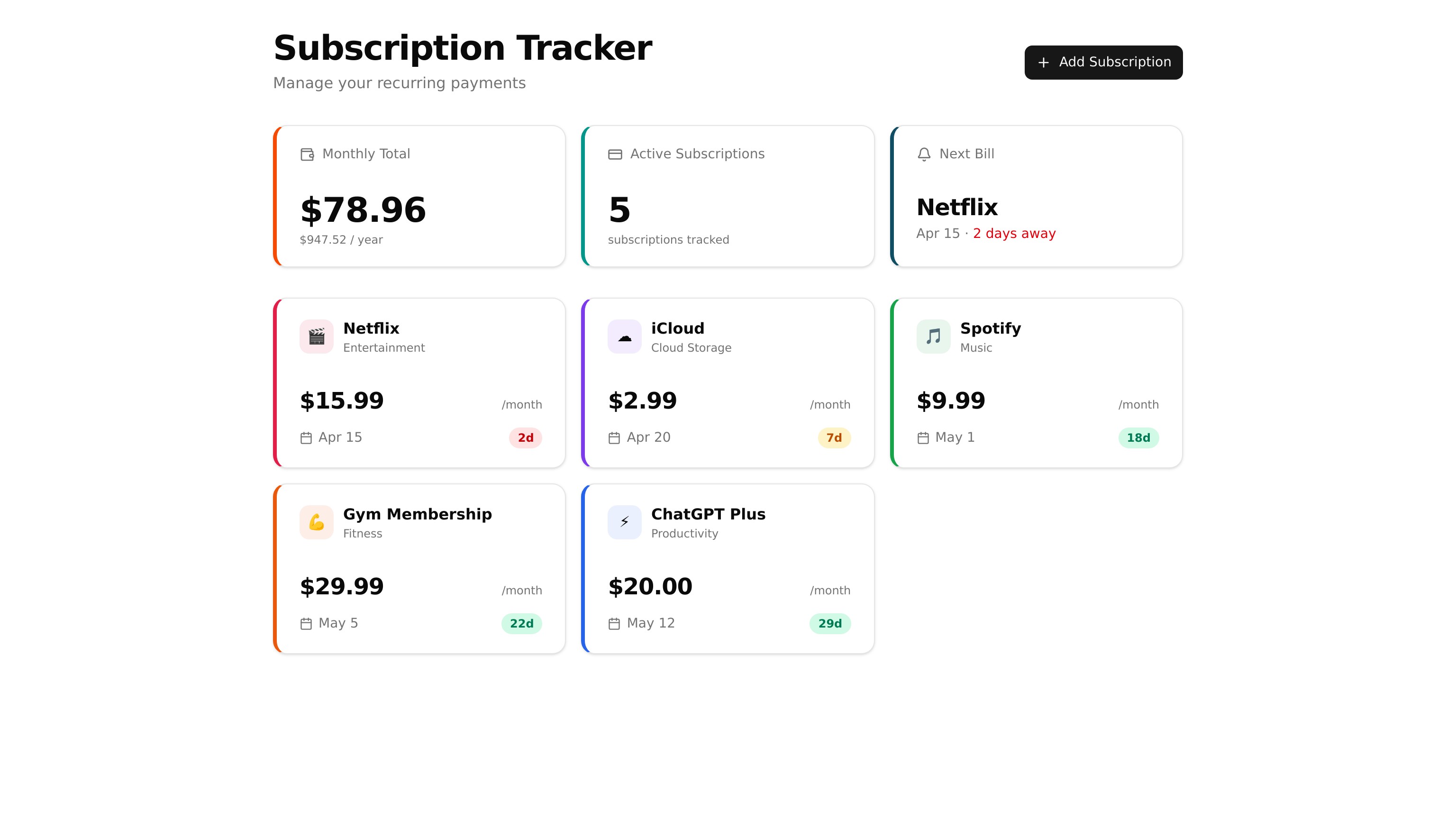Take control of your recurring expenses with a simple, powerful subscription tracker. Track all your subscriptions in one place Get timely reminders before renewal dates View your total monthly and yearly spending Never miss a cancellation window again Designed to help you stay organized, save money, and avoid unnecessary charge