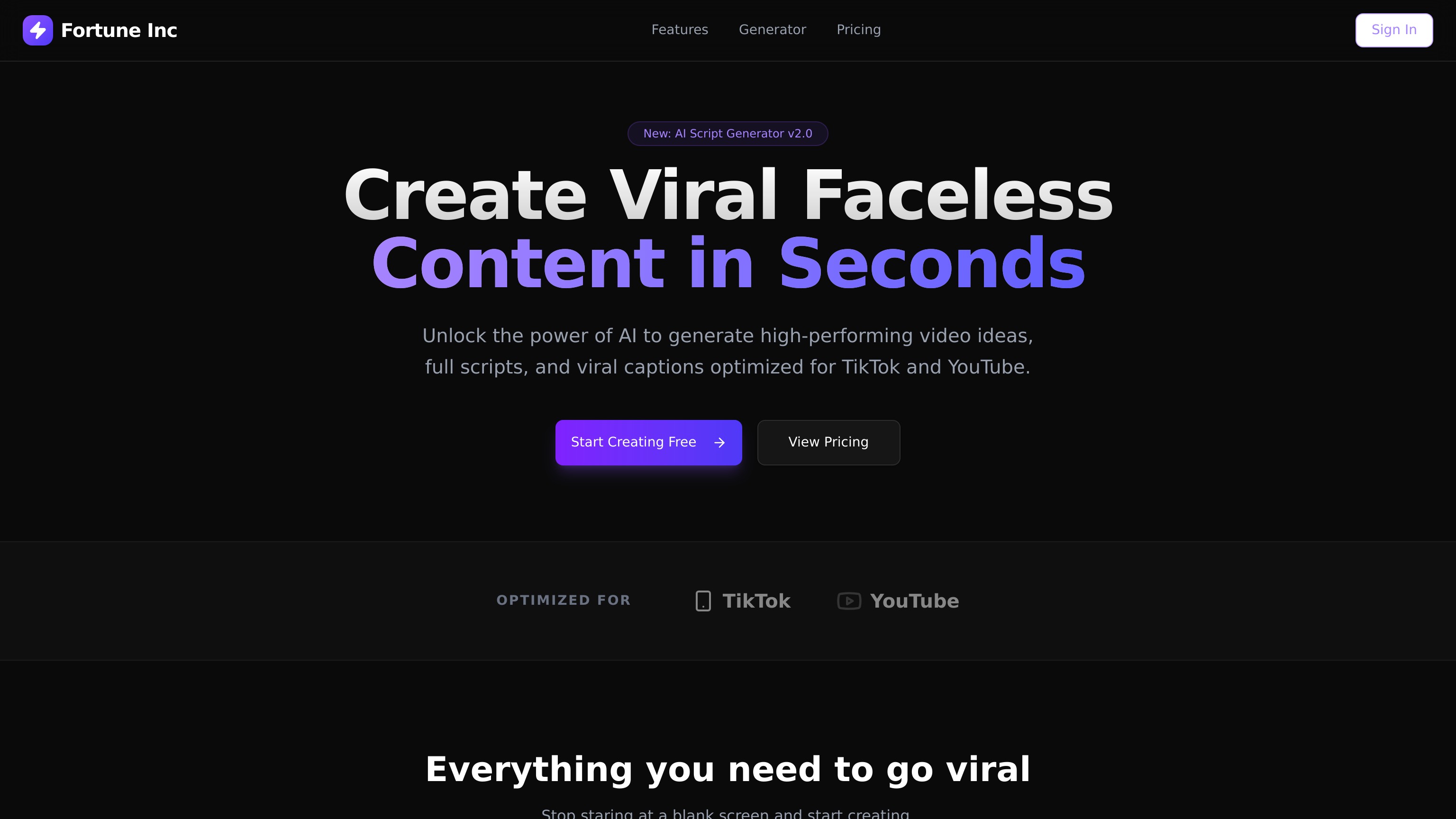 Create viral, high-quality faceless content in seconds without showing your face or spending hours editing. This powerful platform helps you generate engaging videos, captions, and ideas tailored for platforms like TikTok and YouTube. Whether you’re a beginner or content creator, you get everything you need to grow fast—ready-to-use scripts, trending concepts, and simple tools to turn ideas into content that grabs attention and drives engagement. Perfect for anyone looking to build an online presence, grow an audience, and start making money through faceless content.