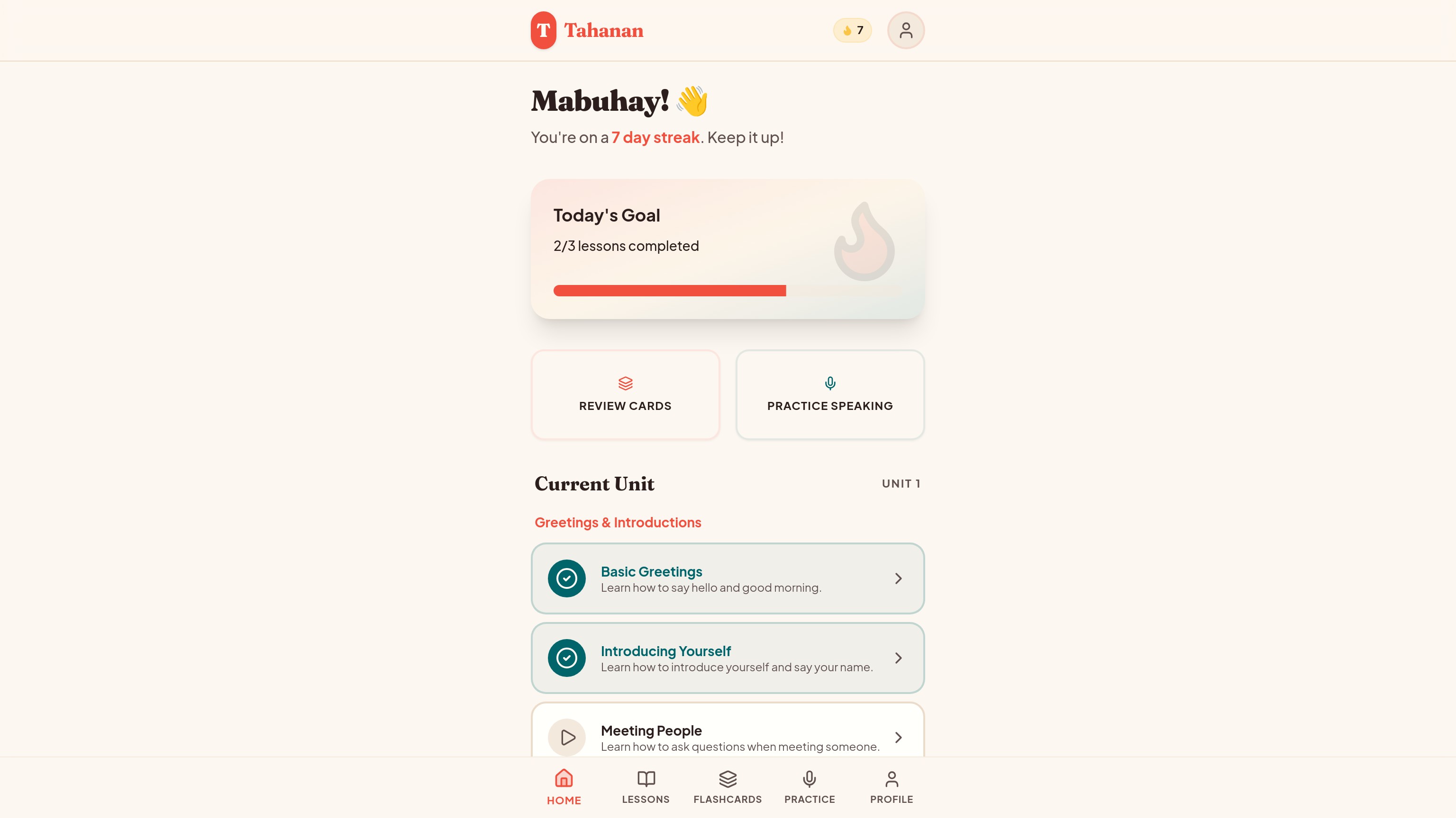 A premium Filipino language learning app with these core features: ๐ Dashboard Welcome message with "Mabuhay!" greeting Streak tracking (๐ฅ 7 day streak!) Daily learning goals progress Quick action cards to jump into lessons, flashcards, or practice ๐ Lesson System Unit: Greetings & Introductions with multiple lessons Vocabulary cards showing Tagalog word, English translation, pronunciation guide, and example sentences Cultural context notes explaining when/how to use phrases Interactive quizzes with multiple choice questions Progress tracking per lesson ๐ Flashcard System (Spaced Repetition) Beautiful 3D card flip animation (tap to reveal) Tagalog โ English with pronunciation Difficulty rating: Hard, Good, Easy (affects review schedule) Cards due counter and progress tracking ๐ค Speaking Practice Practice prompts with target phrases Record button UI (simulated) AI feedback with pronunciation tips and accuracy scores ๐ค Profile View Stats dashboard (streak, lessons completed, words learned, XP points) Achievement badges ๐จ Design Warm sunset palette - coral/orange primary, deep teal secondary, golden accents on cream background Typography - Plus Jakarta Sans for body, Fraunces serif for elegant headers Filipino-inspired warm, welcoming aesthetic that feels like "coming home" (Tahanan = home) Mobile-first with bottom navigation bar Smooth animations throughout