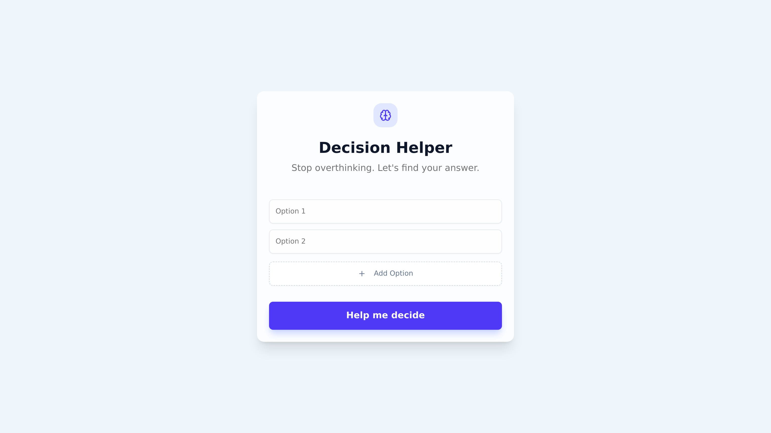It’s basically a simple decision-making app that helps people stop overthinking small choices. You enter a few options, answer a couple of quick questions (like what feels right or what’s best long-term), and the app suggests what you should pick. The idea is to make decisions faster by giving your thinking a bit of structure instead of going back and forth in your head.