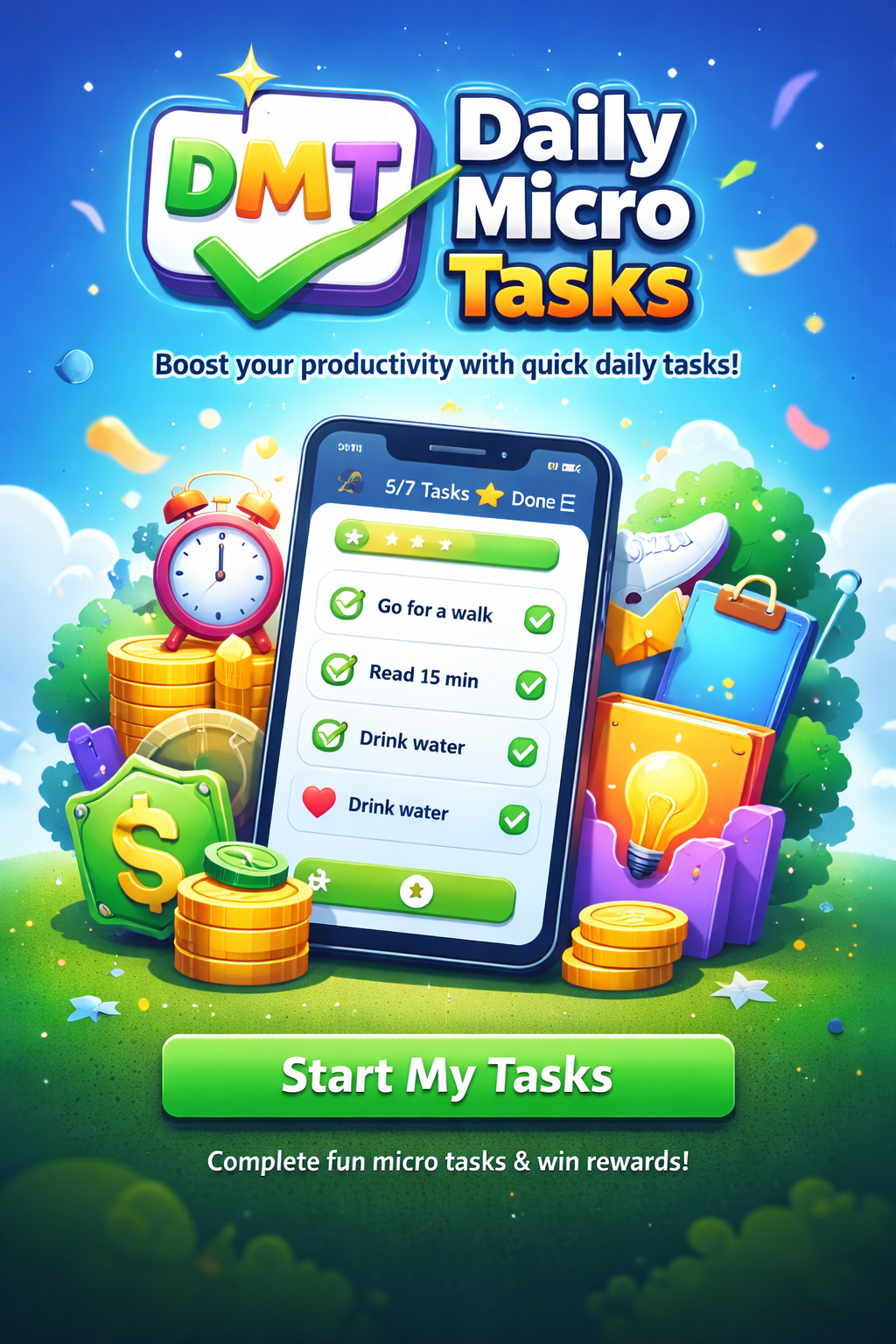 Daily Micro Tasks (DTM) Turn small actions into big results. Daily Micro Tasks (DTM) is your personal productivity companion designed to help you stay consistent, focused, and motivated every day. Whether you’re managing work goals, personal habits, or creative projects, DTM breaks your day into achievable micro tasks that make progress feel effortless. Key Features - ✅ Smart Task Breakdown: Divide large goals into bite-sized daily actions. - ⏱️ Time Tracking & Reminders: Stay on schedule with gentle nudges and progress insights. - 💡 Motivation Boosts: Earn rewards and celebrate milestones as you complete tasks. - 📊 Progress Dashboard: Visualize your achievements and build momentum over time. - 🚀 Customizable Workflows: Tailor your task lists to fit your lifestyle and priorities. DTM helps you focus on what matters most — one micro task at a time. Perfect for freelancers, students, creators, and anyone striving for daily improvement.