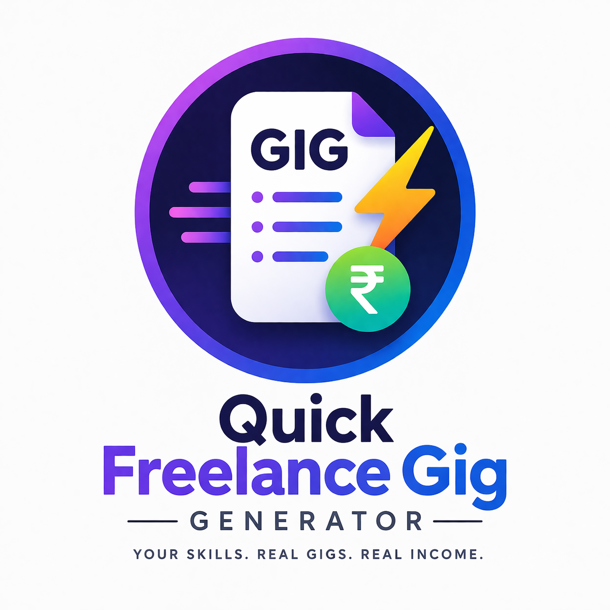The logo of Quick Freelance Gig Generator represents speed, opportunity, and income creation. At the center is a modern document icon labeled “GIG,” symbolizing freelance services and digital work. The lightning bolt element highlights instant idea generation and fast results, while the rupee symbol reflects real earning potential for users. The circular badge design gives a clean and app-friendly look, making it perfect for mobile platforms. The vibrant gradient colors (blue, purple, and green) convey creativity, trust, and growth. The bold, modern typography emphasizes clarity and professionalism, appealing especially to beginners and aspiring freelancers.