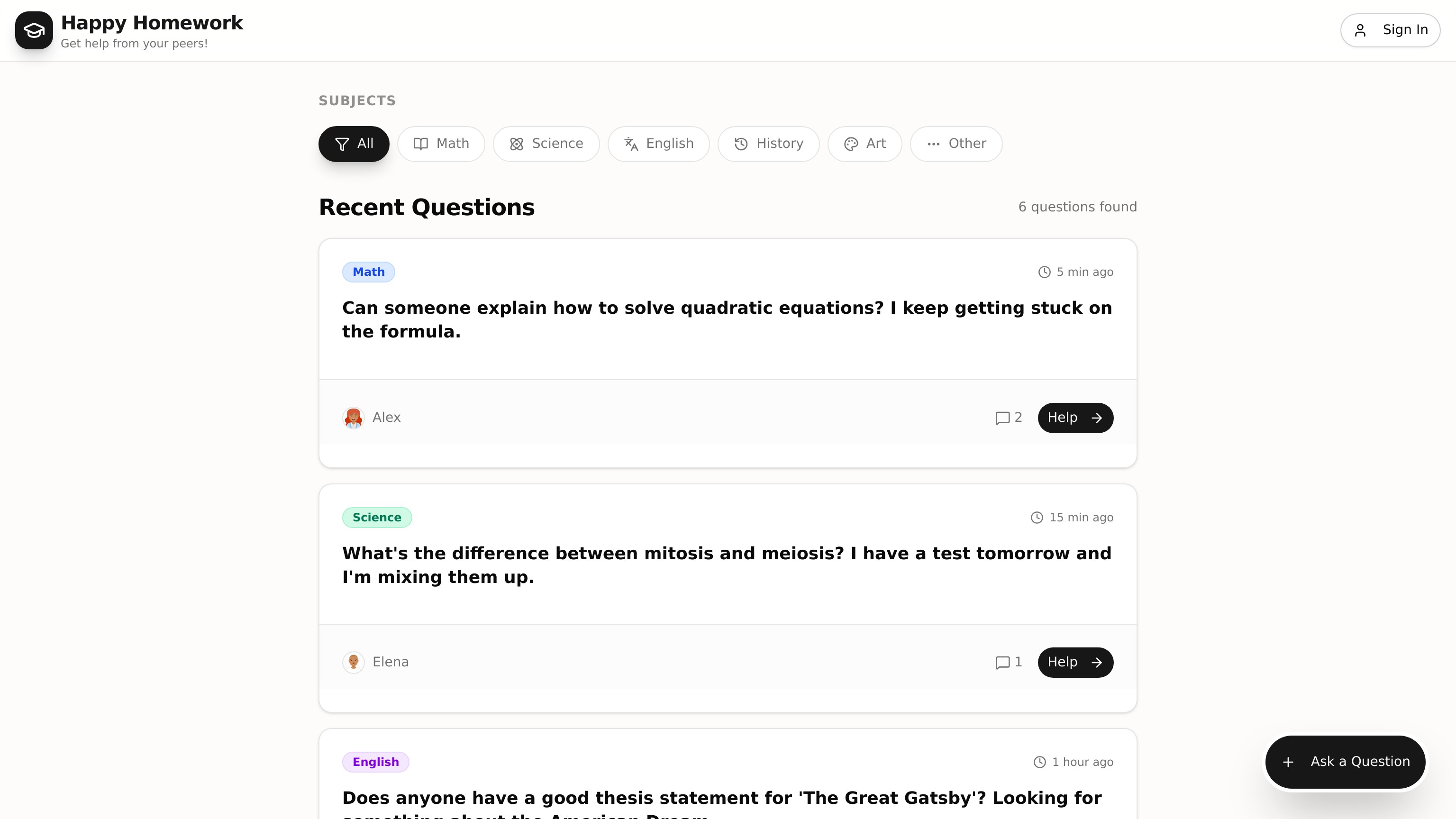 If you are struggling in school with homework, Happy Homework is a place to go where you and other people who are struggling with homework can help find the answers together!