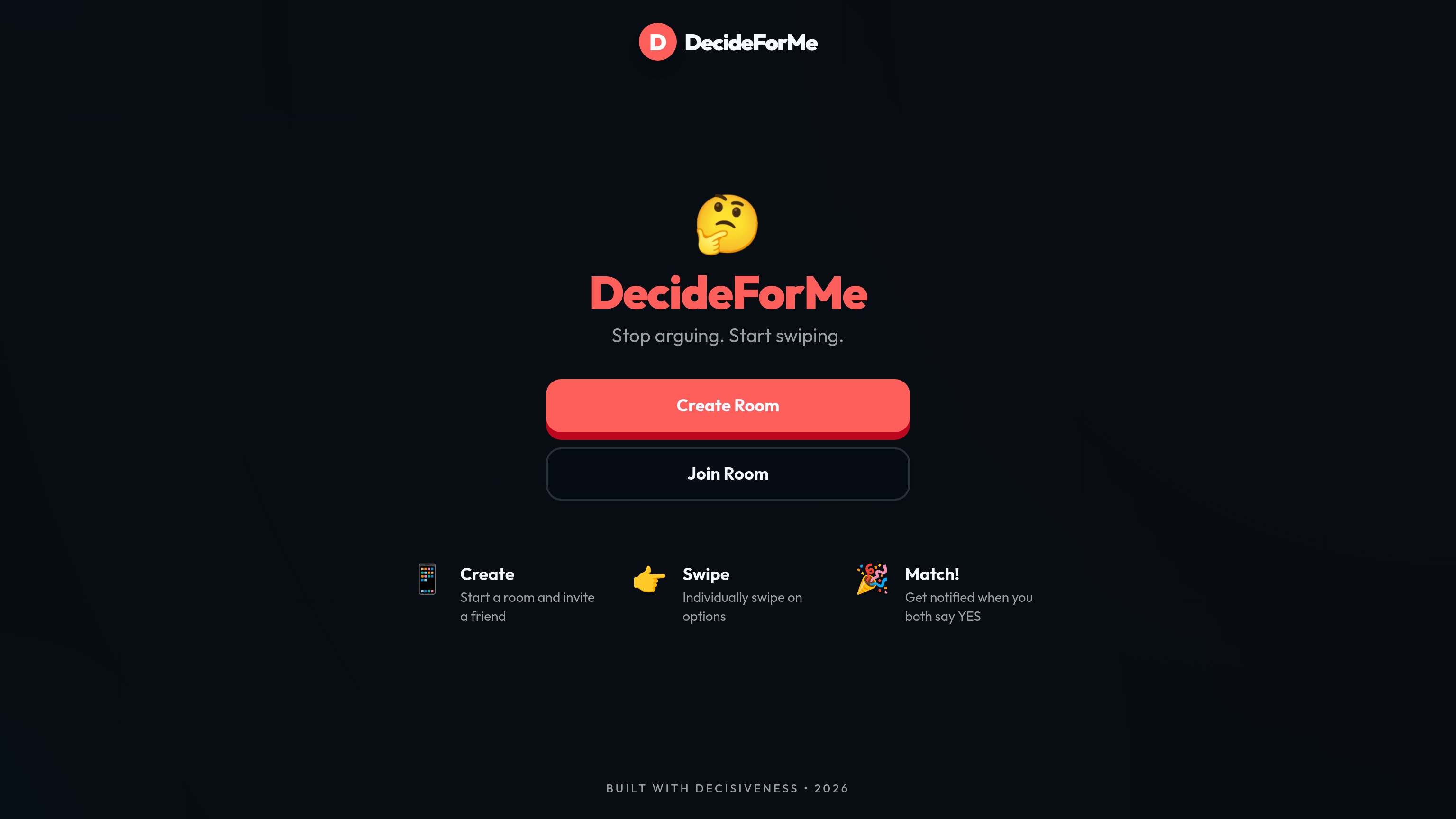 DecideForMe is a social decision-making app that turns the 'What should we do?' argument into a fun, synchronized swiping game for couples and friends."