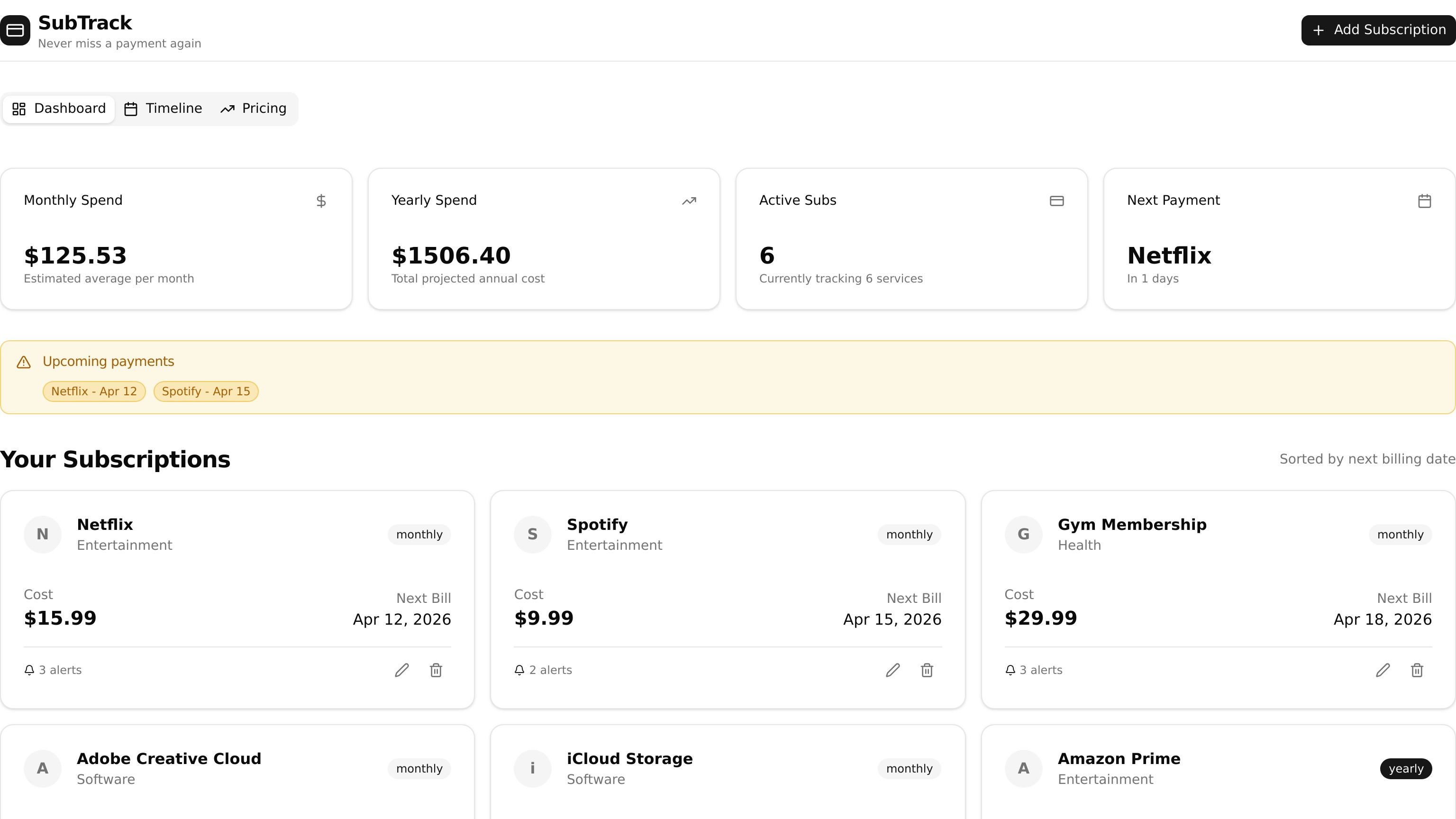 Subscription Tracker is a simple, user-friendly mobile app designed to help people stay on top of their recurring payments and avoid unwanted charges. It allows users to log all their subscriptions—such as streaming services, apps, and memberships—in one place, giving them a clear view of how much they spend each month. The app highlights upcoming payments and sends reminders before billing dates, helping users avoid surprise charges and giving them time to cancel services they no longer need. With an easy-to-read dashboard and organised list of subscriptions, users can quickly understand their spending habits and make smarter financial decisions. Overall, Subscription Tracker provides a convenient way to manage subscriptions, reduce unnecessary expenses, and stay in control of personal finances.