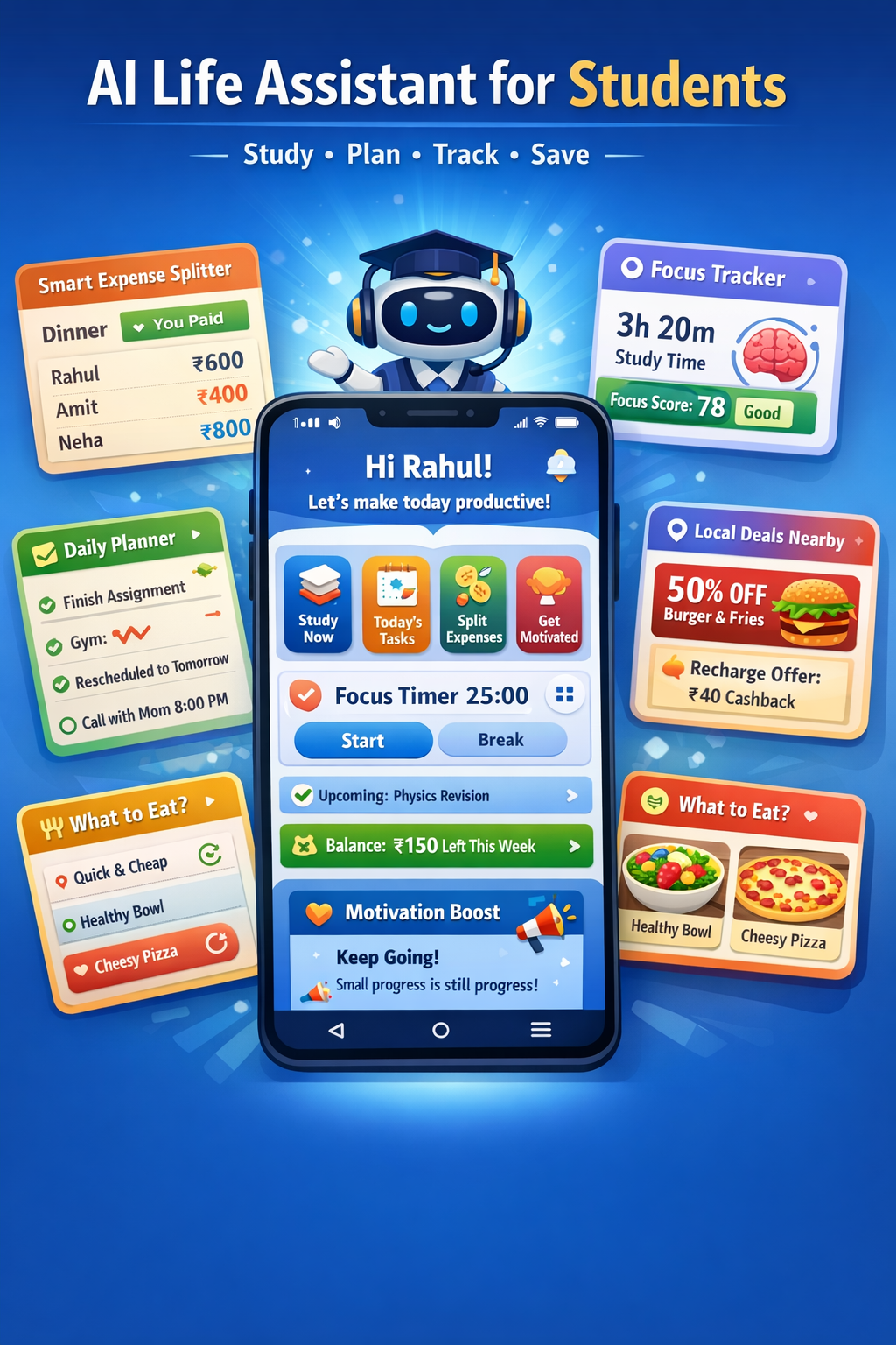 Nexora is your all-in-one AI life assistant designed to simplify, organize, and upgrade your daily routine. Built for students and everyday users, Nexora combines productivity, focus, finance tracking, and motivation into one powerful app—so you don’t need 5 different apps to manage your life.