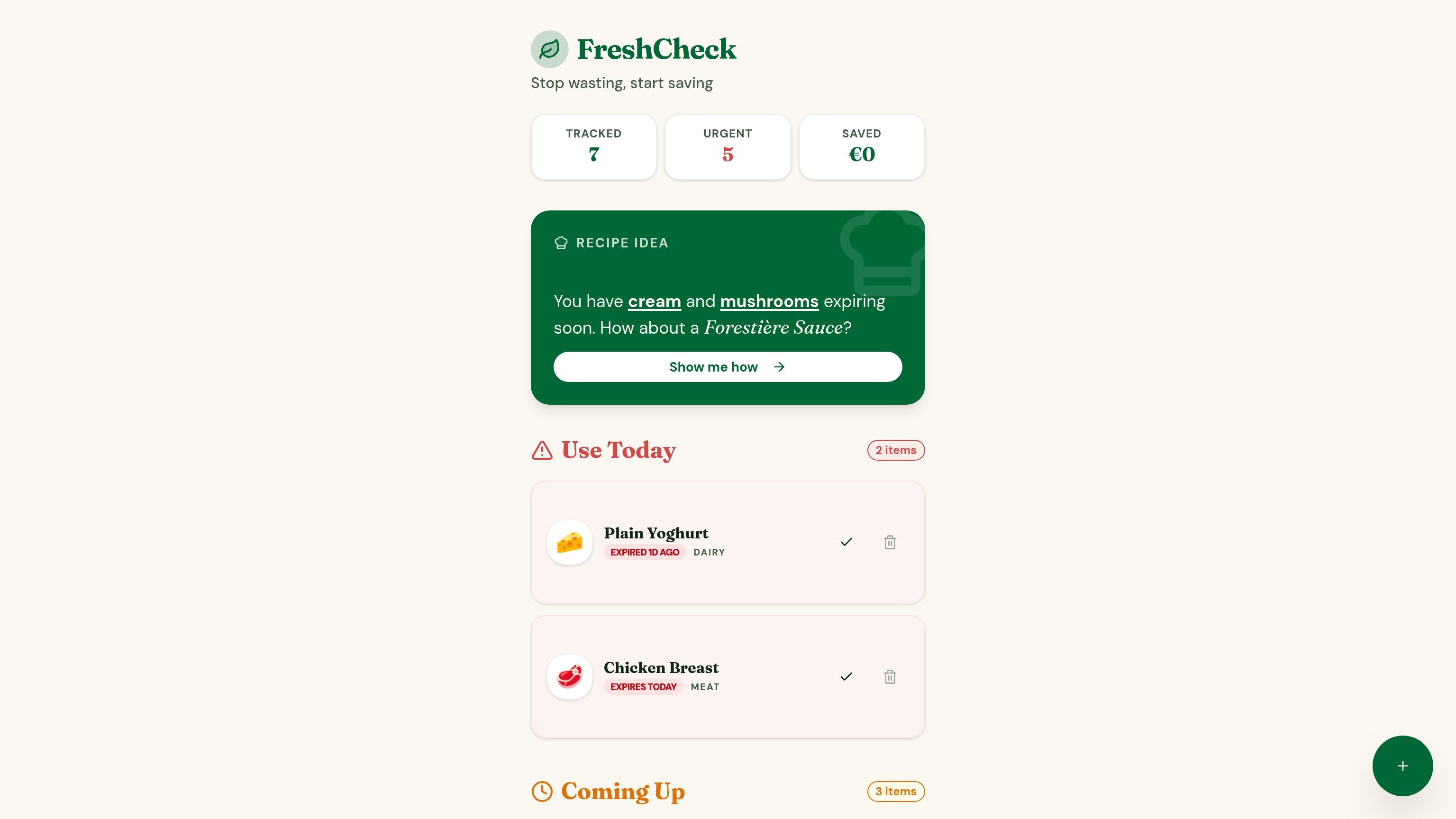 FreshCheck: Your fridge in your pocket. Never throw your money in the bin again. FreshCheck is the smart assistant that simplifies your shopping and eliminates food waste. In just a few seconds, take stock of your perishable items and let the app keep an eye on your kitchen. No more forgetting: Receive smart notifications before your food goes off. Zero stress: See at a glance what’s left in your fridge thanks to an intuitive colour-coding system (Green, Orange, Red). Zero waste: Get quick recipe ideas based on your ingredients that need using up soon. Simple. Fast. Responsible. Save an average of €400 a year whilst doing your bit for the planet.