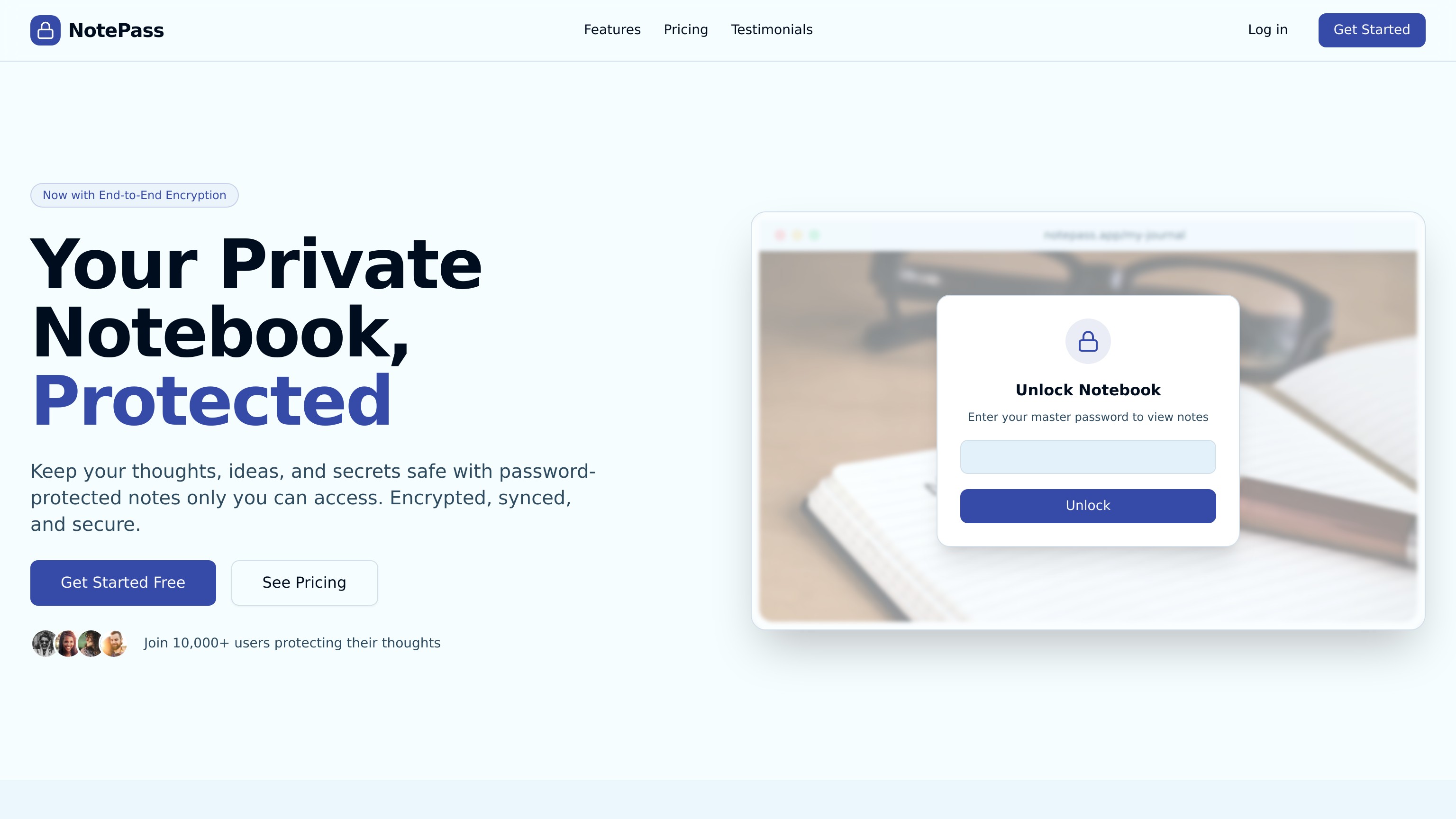 NotePass is a secure, all-in-one web app that combines the simplicity of a notebook with the protection of a password manager. It lets you write, organize, and store your notes while keeping sensitive information safe behind strong encryption. With NotePass, you can create everything from quick reminders and ideas to private credentials and confidential documents all in one place. Each note can be protected with an additional password layer, ensuring that only you can access what matters most. Designed with a clean, distraction free interface, NotePass makes it easy to stay organized while maintaining peace of mind. Whether you're managing personal thoughts, storing login details, or keeping track of important information, NotePass gives you a seamless and secure way to do it.